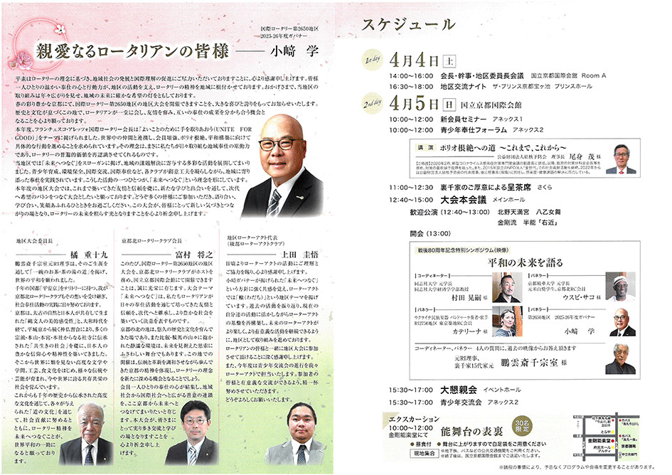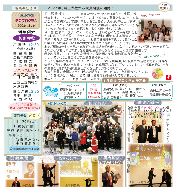 地区のサイトに情報発信 New 1/6、1970号の週報を発行 11月、同好会「美食の会」丹波篠山の旅美食の 110 10月3日・守山・野洲RC合同ガバナー公式訪問 New12026年4月・地区大会リーフレット 2026年4月4日5日 地区大会チラシ 堀内ガバナー補佐退任、お疲れ様でした。 びわ湖わんにゃんマルシェ2025に協賛 前年度例会皆出席の皆さん 2025インターシティミーティング 長谷川成幸会員、2023年度 現代の名工に! I2 8gaRI2650地区サイト、野洲プロフィール更新 現ビジター受付情報 ↓最新号の週報ピックアップ↓ 週報の全体はこちらプ 10