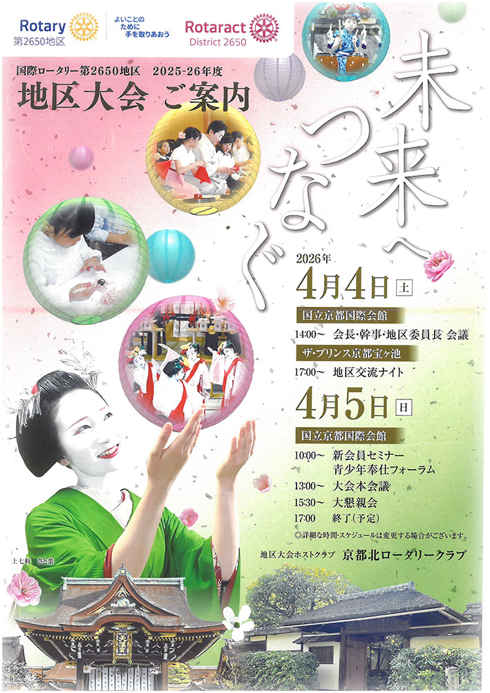 地区のサイトに情報発信 New 10/7、1962号の週報を発行 202026年4月 日 地区大会案内 堀内ガバナー補佐退任、お疲れ様でした。 びわ湖わんにゃんマルシェ2025に協賛 前年度例会皆出席の皆さん 025インターシティミーティング 長谷川成幸会員、2023年度 現代の名工に! I2 大阪・関西万博の開幕日に訪問! 8gaRI2650地区サイト、野洲プロフィール更新 現ビジター受付情報 ↓最新号の週報ピックアップ↓ 週報の全体はこちらプ