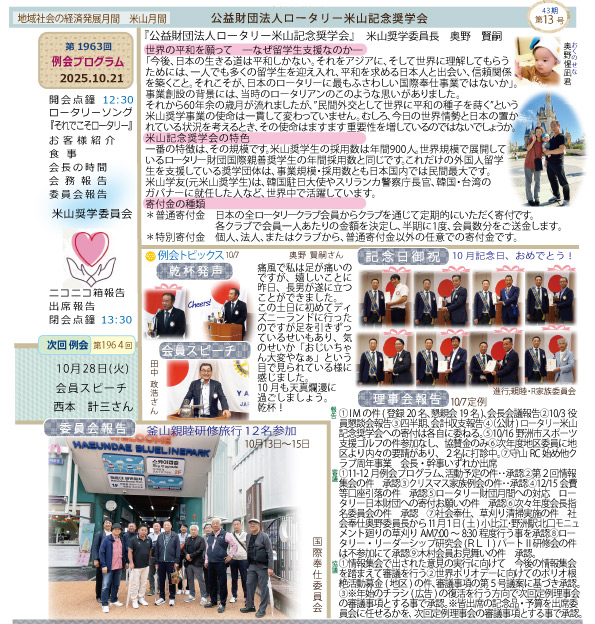 地区のサイトに情報発信 New 10/21、1963号の週報を発行 110 10月3日・守山・野洲RC合同ガバナー公式訪問1 2026年4月4日5日 地区大会案内 堀内ガバナー補佐退任、お疲れ様でした。 びわ湖わんにゃんマルシェ2025に協賛 前年度例会皆出席の皆さん 2025インターシティミーティング 長谷川成幸会員、2023年度 現代の名工に! I2 大阪・関西万博の開幕日に訪問! 8gaRI2650地区サイト、野洲プロフィール更新 現ビジター受付情報 ↓最新号の週報ピックアップ↓ 週報の全体はこちらプ 10
