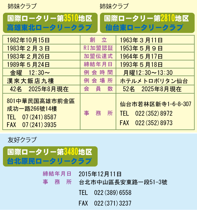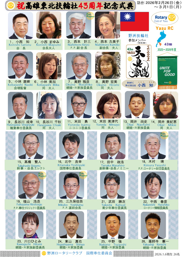 期 姉妹クラブ交流 42期 高雄東北RCから27名のメンバー&ご家族が来日されました 43期 高雄東北RCの43周年記念式典参加者一覧 43期 高雄東北RCの43周年記念式典に26名の会員&家族が出席