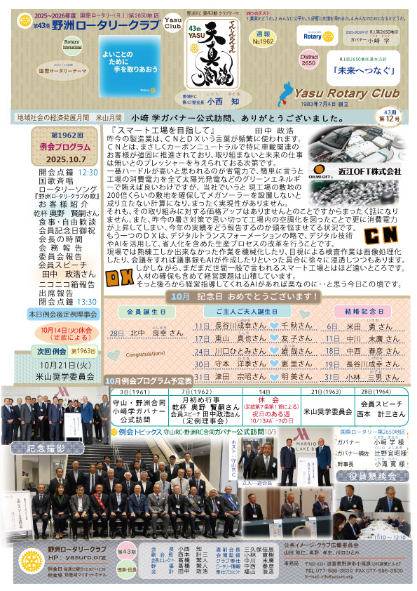 地区のサイトに情報発信 New 10/7、1962号の週報を発行 202026年4月 日 地区大会案内 堀内ガバナー補佐退任、お疲れ様でした。 びわ湖わんにゃんマルシェ2025に協賛 前年度例会皆出席の皆さん 025インターシティミーティング 長谷川成幸会員、2023年度 現代の名工に! I2 大阪・関西万博の開幕日に訪問! 8gaRI2650地区サイト、野洲プロフィール更新 現ビジター受付情報 ↓最新号の週報ピックアップ↓ 週報の全体はこちらプ