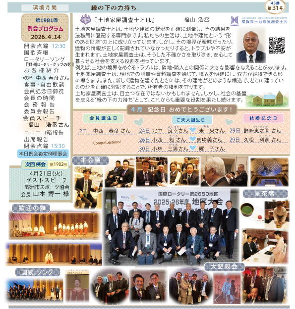 地区のサイトに情報発信 New 4/14、1981号の週報を発行 2026年2月 姉妹クラブ交流 11月、同好会「美食の会」丹波篠山の旅美食の 1110月3日・守山・野洲RC合同ガバナー公式訪問 12026年4月・地区大会リーフレット 2026年4月4日5日 地区大会チラシ Newびわ湖わんにゃんマルシェ2025に協賛 前年度例会皆出席の皆さん 2025インターシティミーティング 長谷川成幸会員、2023年度 現代の名工に! I2 RI2650地区サイト、野洲プロフィール更新 現ビジター受付情報 ↓最新号の週報ピックアップ↓ 週報の全体はこちらプ 10